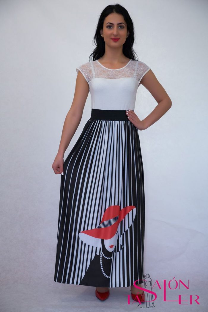 Pruhovaná sukňa s motívom Dámy v klobúku z príjemného padavého materiálu. V páse nazberaná do gumy š. 5 – 6 cm. Dĺžka 80 cm, na boku mierny rázporok. Sukňa z dielne KTD STYLE je elegantná, vhodná na pracovné rokovania aj slávnostné príležitosti. Šité na mieru.
