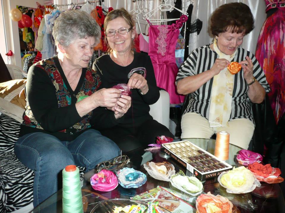Inšpiratívne popoludnie strávili vo štvrtok 19. marca členky klubu Nádej, ktorý pôsobí pri Onkologickej spoločnosti, v ktorom sa stretávajú onkologické pacientky a ich priaznivci. Pozvaním do krajčírskeho salónu, som tak splnila dávnejší prísľub, ktorý som im dala, pri predstavovaní modelov z mojej módnej tvorby. Spestrením programu bolo, že si vyskúšali zhotovenie kvetín z jemných textilných tkanín, ozdobovali ich perličkami, farebnými pierkami a lupienkami kvetov. V prostredí plnom krásnych modelov a plesových rób ženy neodolali a niekoľko z nich hneď aj vyskúšali.